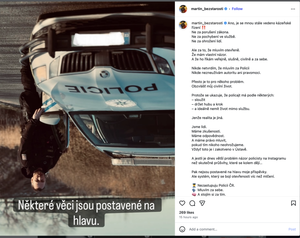 Narazil jsem na Instagramu, zcela náhodně, na profil policisty, konkrétně na tenhle příspěvek: