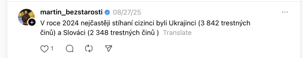 A níže ukázka, jak šíří nenávist. Naštěstí mu to moc nejde. Z pozice autority a policisty sdílí statistiku která je nic neříkající, neboť vůbec nebere v potaz to kolik jich zde je (tj. poměr stíhání vs množství), jen vytáhne číslo se snahou vyvolat nenávist.